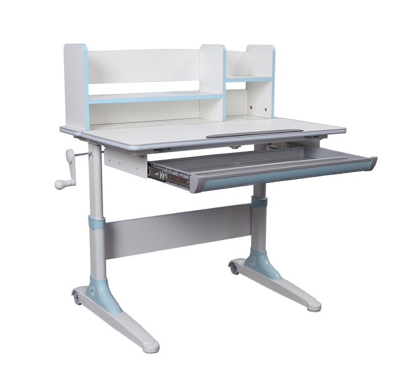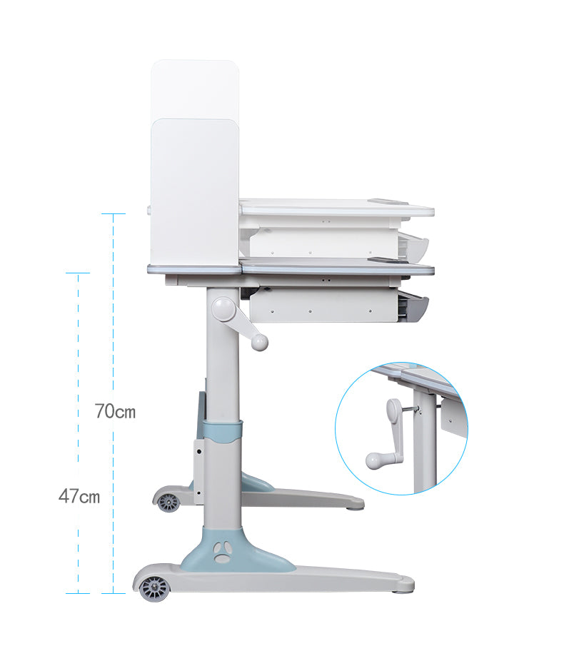 桌椅腳架均采用加厚碳鋼金屬管材,烤漆工藝表面處理,坚固耐用;書桌採用靜音手搖式升降設計,