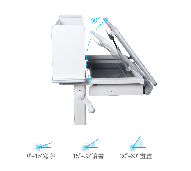 桌面可傾斜0-60度的任意角度,無論讀書、寫字、畫畫,都能讓孩子有個舒適的角度;雙層書架設計,擁有更大的存儲空間,同時也方便收納存儲;