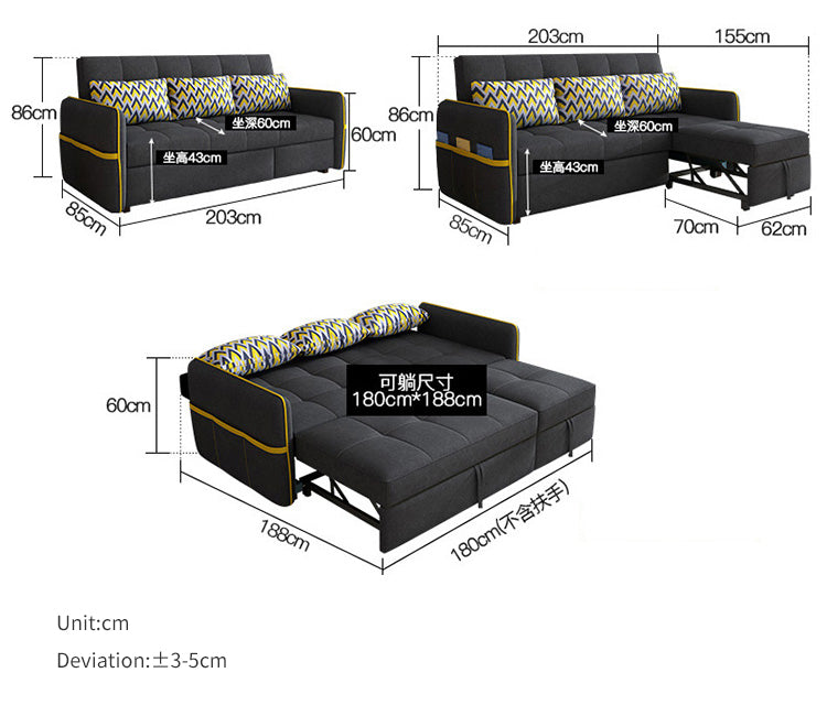 Sofa can be arranged into a bed or a L-shape Sofa for just couple of simple steps. Washable fabric cover with solid wood frame and metal hardware, strong and durable. No installation need.