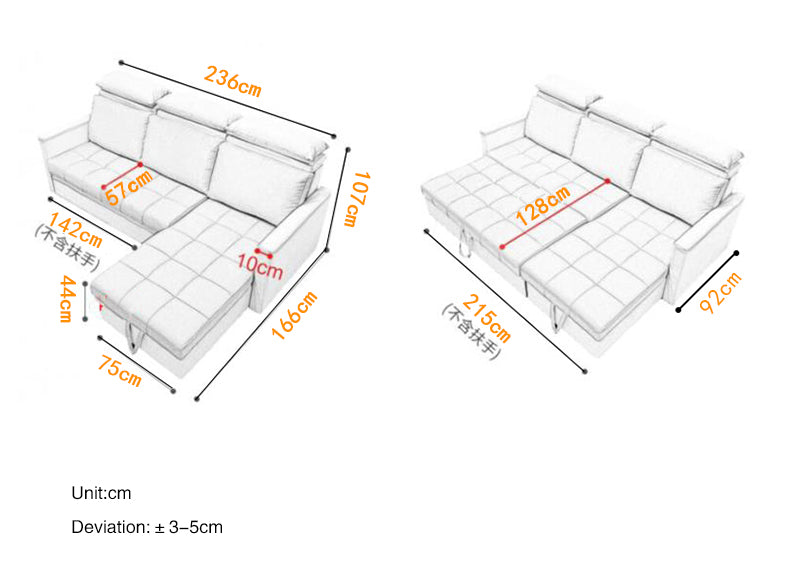 | Washable fabric cover with solid wood frame and metal hardware, strong and durable. Headrest can be adjustable with Multi-angle. Sofa can be arranged into a bed for just a simple step with Storage. |