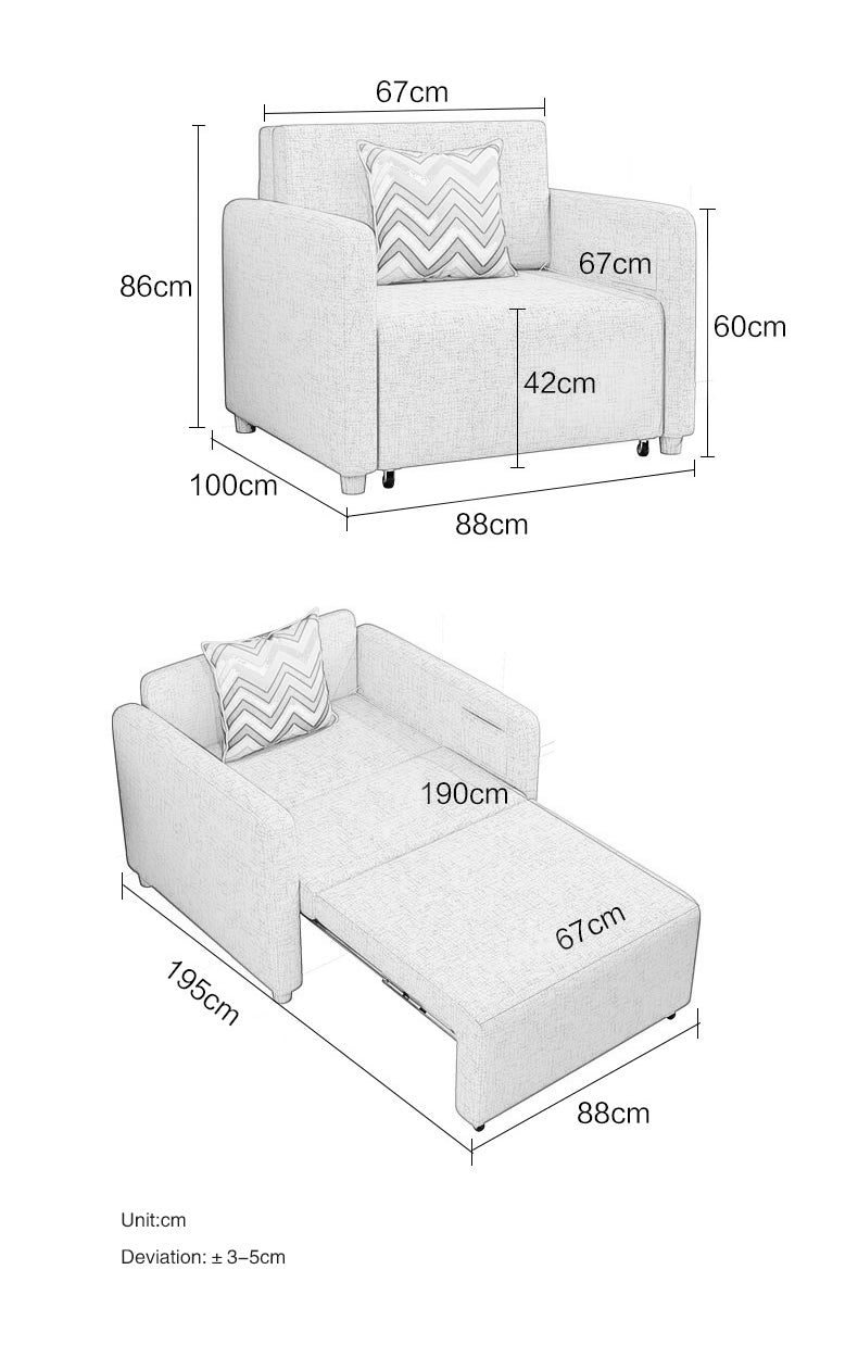 Sofa can be arranged into a bed for just couple of simple steps. Washable fabric cover with solid wood frame and metal hardware, strong and durable. There are a storage under the seat.